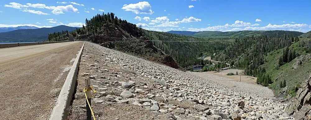 Granby Dam (National ID # CO01656) is an earthfill dam that dams the Colorado River 5.5 miles (8.9 km) northeast of Granby, Colorado in Grand County, Colorado. This 298-foot (91 m)-tall dam was constructed between 1941 and 1950 and has a drainage area of 311 square miles (810 km2). The Granby Dam's reservoir is known as Lake Granby, the largest reservoir component of the Colorado-Big Thompson Project. Lake Granby stores Colorado River water that is diverted under the Continental Divide for agriculture and municipal use within north-eastern Colorado including the cities of Boulder, Fort Collins, Loveland, and Greeley. In addition to the waters of the Colorado, water from Willow Creek just below the dam is pumped up 175 feet (53 m) to Lake Granby. Water from Lake Granby is pumped 125 feet (38 m) higher by the Granby Pumping Plant to the Granby Pump Canal, which extents 1.8 miles (2.9 km) to Shadow Mountain Lake, from which water is diverted through the Alva B. Adams Tunnel to the East Slope.[2]