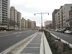 The road itself was modified to be more hospitable to motorists.[22] During the 1960s, the New York City Department of Parks and Recreation removed the grass median on the Concourse and replaced it with cement that was painted green.[23] By the 1980s, The New York Times characterized the Concourse as "a driver’s paradise". Traffic lights were timed so that motorists received a "green wave", moving through multiple intersections per light cycle. Meanwhile, pedestrian crossings and trees were eliminated, and green highway signs were placed on the Concourse.[24]