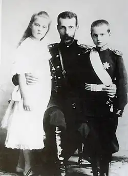 At birth, Dmitri had an older sister, Grand Duchess Maria Pavlovna, with whom he had a close relationship throughout his life. Grand Duke Paul was so distraught by the unexpected death of his young wife that he initially neglected his two small children: Dmitri and his older sister Grand Duchess Maria Pavlovna.[2] The children were therefore largely cared for by Paul's elder brother, Grand Duke Sergei Alexandrovich, and his wife Grand Duchess Elizabeth Feodorovna, who had no children of their own.[2] They spent Christmases and later some summer holidays with Grand Duke Sergei and Grand Duchess Elisabeth who set aside a playroom and bedrooms for the youngsters at their country home, Ilinskoe.