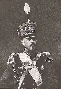 Sergei Mikhailovich loved the military life and served in a number of regiments. Like his father, he was drawn towards ordnance and artillery. After graduating from the Mikhailovsky Artillery School, he started his military service in the Life Guard of the Cavalry Artillery Brigade.[3] In 1891, he became aide-de-camp to the Emperor and in 1899 was promoted to the rank of colonel.[3] In 1904, he was made major general in the House Guards Artillery Brigade of the suite of the Tsar.[2] He replaced his father in 1905 as Inspector General of Artillery, a post he held until 1915 when he was removed under controversy during World War I. In 1908, he became adjutant General.[2] In 1914, he was promoted to the rank of General of Cavalry.[2] From January 1916, he served as Field Inspector General of the Artillery until he resigned his military post at the fall of the monarchy.[2]