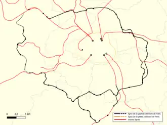 The Grande Ceinture line (French: Ligne de Grande Ceinture, English: Big Belt Line) is a railway line around Paris, located 15 kilometres (9.3 mi) from the Boulevard Périphérique. The decision to build it was taken at the end of the 19th century, to connect the radial lines linking the capital to the provinces and provide relief to the busy Petite Ceinture Line (English: Small Belt Line).