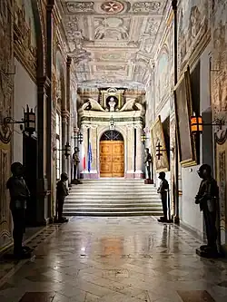 The palace was modified and embellished by subsequent Grand Masters, which gave the building a Baroque character. The ceilings of the main corridors were decorated with frescoes by Nicolau Nasoni in 1724, during the magistracy of António Manoel de Vilhena.[5] In the 1740s, Grand Master Manuel Pinto da Fonseca made extensive alterations to the building and gave it its present configuration. Pinto's renovations included the embellishment of the façade, the opening of a second main entrance, and the construction of a clock tower in one of the courtyards.[9]