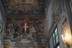 The cycle of wall paintings decorating the upper part of the hall are the work Matteo Perez d'Aleccio and represent various episodes of the Great Siege of Malta. The coat-of-arms of Grand Master Jean de Valette on the wall recess behind the minstrels gallery was painted by Giuseppe Calì.