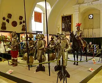 The original hall of the armoury was converted into the meeting place of the Parliament of Malta in 1975–76,[16] and the arms collection was relocated to two former stables at the palace's ground floor, where it remains today. The armoury has been open to the public as a museum since 1860.[21] Part of the restoration works currently underway include the relocation of the palace armoury back to its original location.