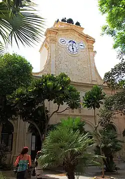 Prince Alfred's Courtyard contains a clock tower, which includes the Moors Clock as well as three other dials. The clock was designed by Gaetano Vella and it was inaugurated on 11 June 1745, being modified by Michelangelo Sapiano in 1894. Local tradition states that the clock is much older, having been brought from Rhodes at the time of the Order's arrival in Malta in 1530.[29]