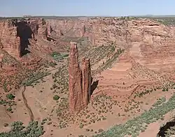 In Navajo mythology, Spider Woman (Na'ashjé'íí Asdzáá) is the constant helper and protector of humans.[8] Spider Woman is also said to cast her web like a net to capture and eat misbehaving children. She spent time on a rock aptly named spider rock which is said to have been turned white from the bones resting in the sun.[9]