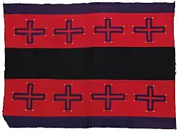 The Diné Bahaneʼ creation narrative of the Navajo (recorded 1928) includes a mention of "Spider Woman and Spider Man", who introduced the spindle and the loom.[10] In another myth, "Spider Woman" aided the twins (born of the Sun and the Changing Woman) in killing the monsters that were endangering "The Earth surface People" by giving them "feather hoops" that protected them from attacks. In another myth, two women come to "Spider Woman" hoping for a solution to help the Navajo people bear the winter. She taught the women how to make yarn from sheep wool, and to dye it and weave it. From this, the women taught the other villagers how to do these things, and the village was able to make rugs to use and sell to help survive the winter.[9]