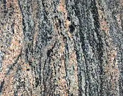 The word "granite" comes from the Latin granum, a grain, in reference to the coarse-grained structure of such a completely crystalline rock.[2] Granites can be predominantly white, pink, or gray in color, depending on their mineralogy. Granitic rocks mainly consist of feldspar, quartz, mica, and amphibole minerals, which form an interlocking, somewhat equigranular matrix of feldspar and quartz with scattered darker biotite mica and amphibole (often hornblende) peppering the lighter color minerals. Occasionally some individual crystals (phenocrysts) are larger than the groundmass, in which case the texture is known as porphyritic. A granitic rock with a porphyritic texture is known as a granite porphyry. Granitoid is a general, descriptive field term for lighter-colored, coarse-grained igneous rocks. Petrographic examination is required for identification of specific types of granitoids.[3] The alkali feldspar in granites is typically orthoclase or microcline and is often perthitic. The plagioclase is typically sodium-rich oligoclase. Phenocrysts are usually alkali feldspar.[4]
