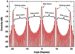 In antenna or transducer arrays, a grating lobe is defined as "a lobe other than the main lobe, produced by an array antenna when the inter-element spacing is sufficiently large to permit the in-phase addition of radiated fields in more than one direction."[1]