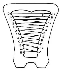 The Gravikord is tuned to a diatonic scale. Its standard scale is in the key of G major/E minor. It has 24 strings, 12 on each side, and is structured like an extended Hugh Tracey kalimba, an already westernized African instrument. The range of notes on both sides are the same and tuning is strictly in an alternate arrangement (except for the lowest bass note), so that the playing is equivalent between the left and right hands. This is reflected in the way the holes are drilled in the neck and the choice of string lengths and weights. A constant finger picking pattern will produce a constant musical pattern throughout the instrument's range.