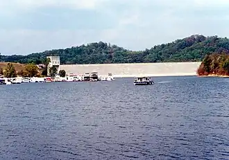 Grayson Lake is a 1,500-acre (6.1 km2) reservoir in Carter and Elliott counties in Kentucky. It was created by the United States Army Corps of Engineers in 1968 by impounding the Little Sandy River[3] with the Grayson Dam, an earthen structure 120 feet (37 m) high, creating a maximum capacity of 118,990 acre-feet (146,770,000 m3). Sections of Kentucky Route 7 were re-routed as a result of the lake's creation. KY 7 now traverses a modern highway stretch around the park, crossing the dam also.