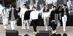 The nine members of GreatGuys—Jaei, Uiyeon, Horyeong, Daun, Baekgyeol, Donghwi, Hwalchan, Haneul, and Dongin—were trainees for three years.[1][2] The name of the group signifies its ability to be "show a cool image on and off stage".[3] With an average height of 185 centimetres (6.07 ft), they have been dubbed "the tallest idols".[4] The nonet released its debut synth-pop digital single album Last Men and its title track on August 25, 2017.[5] The group held a showcase in Japan the following January.[6] A tropical dance song, GreatGuys' second single album Ganda and eponymous title track was released on April 7, 2018.[7] Main vocalist Daun contributed to the song's lyrics and Dongin wrote the rap portions of the track.[8] A Japanese version was issued two months later.[9] The group received the Rookie of the Year Award at the 2018 Asia Model Awards ceremony.[10]