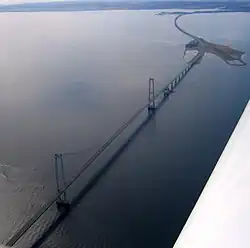 The Great Belt Bridge (Danish: Storebæltsbroen) or Great Belt fixed link (Danish: Storebæltsforbindelsen) is a multi-element fixed link crossing the Great Belt strait between the Danish islands of Zealand and Funen. It consists of a road suspension bridge and a railway tunnel between Zealand and the small island Sprogø in the middle of the Great Belt, and a box-girder bridge for both road and rail traffic between Sprogø and Funen. The total length is 18 kilometres (11 mi).[2]