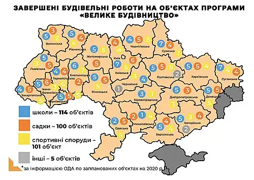 The program was initiated by the President of Ukraine, Volodymyr Zelenskyy, in March 2020, and its implementation began under the Ministry for Communities and Territories Development. The program involves the reconstruction and construction of schools, kindergartens, and sports infrastructure.[5] In 2020, it was planned to complete 10 long-term construction projects.[6] Throughout 2020, 150 km of roads leading to international border checkpoints were repaired,[7] and 216 bridges were built or renovated.[8]