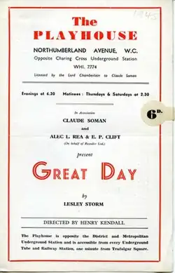 Great Day is a 1945 play by the British writer Lesley Storm. It portrays the excitement generated in an English village by the upcoming visit of American First Lady Eleanor Roosevelt.