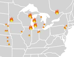 The Great Fires of 1871 were a series of conflagrations that took place throughout the final days of September and first weeks of October 1871 in the United States and elsewhere, primarily occurring in the Midwestern United States. These fires include the Great Chicago Fire, Peshtigo Fire, and Great Michigan Fire. In total, the fires burnt more than 3,000,000 acres (1,200,000 ha) of land and killed thousands.[1]
