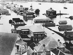 The 1893 Brisbane flood, occasionally referred to as the Great Flood of 1893 or the Black February flood, occurred in 1893 in Brisbane, Queensland, Australia. The Brisbane River burst its banks on three occasions in February 1893. It was the occurrence of three major floods in the same month that saw the period named "Black February". There was also a fourth flood later in the same year in June. The river runs through the centre of Brisbane with much of the population living in areas beside the river. It first flooded on 6 February 1893 due to a deluge associated with a tropical cyclone, called "Buninyong".[1][2]
