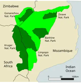 Great Limpopo Transfrontier Park is a 35,000 km2 peace park that is in the process of being formed. It will link the Limpopo National Park (formerly known as Coutada 16) in Mozambique, Kruger National Park in South Africa, Gonarezhou National Park, Manjinji Pan Sanctuary and Malipati Safari Area in Zimbabwe, as well as the area between Kruger and Gonarezhou, the Sengwe communal land in Zimbabwe and the Makuleke region in South Africa.