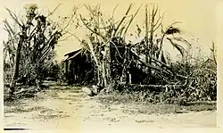 Although no fatalities were reported, the hurricane wrought extensive property damage to Grand Turk Island. Rain gauges recorded 10 in (250 mm) of rain during the storm, and high surf left knee-deep sand drifts on the island.[9] The ocean covered the land up to 3⁄4 mi (1.2 km) inland, and winds unroofed buildings at the weather station. Reportedly, the winds even ripped spines from prickly pear cacti.[9] Nearly all lighters at port were lost.[14] The storm left 4,000 people homeless on three of the islands in the Turks and Caicos.[15] Due to hampered communication, the extent of damage in the Bahamas was initially unclear.[16] In the Bahamas, the storm flattened hundreds of structures and killed at least 17 people, mostly on Bimini, where seven people died and the greatest property damage occurred. The hurricane also leveled many structures on Andros, including churches and large buildings, and downed trees and other homes on New Providence.[3] On parts of Andros, the storm snapped or felled almost all of the coconut palms,[17] and in the Exuma district a large storm surge ruined many crops.[18] The storm also destroyed 60% of the homes on the north island of Bimini, left water up to 7 ft (2.1 m) deep in some areas, and was widely considered the worst storm on record in Bimini to date. Some sources say 25 people died on Bimini, but these may have been indirect deaths, as many people reportedly perished after drinking contaminated well water.[19]