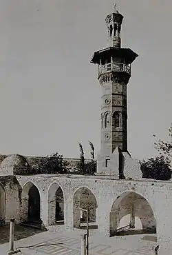 The site of the building was originally a Roman temple dating to the 3rd century.[1] It was converted into a church during the Byzantine Empire era, probably in the 6th century.[2] It was converted into a mosque in the early Islamic era, although the details and dating of this conversion have been the subject of debate by scholars.[3][4] Prior to its later destruction, the building contained many reused elements dating from the Roman or Christian Byzantine eras.[4] One 14th-century Muslim historian, Abu al-Fida', claimed that the church was converted into a mosque right after the conquest of the city in 636–7 CE, during the time of Caliph Umar, but modern scholars have expressed skepticism about this dating, as it appears to be implausibly early.[5][4] Some, such as Bernard O'Kane, have suggested the conversion took place in the Umayyad period (late 7th or early 8th century), while Maria Guidetti has suggested it could be in the late 8th century during the early Abbasid period.[6] There has also been debate over the dating of physical elements of the mosque: Jean Sauvaget argued that the riwaqs (arcades) in its courtyard and the east and west walls of the prayer hall could be dated to the Umayyad period, whereas K. A. C. Creswell cast doubt on this dating.[7]