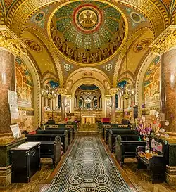 St Christopher's Chapel is a chapel decorated in the Byzantine style and Grade II* listed building located in the Variety Club Building of the hospital. Designed by Edward Middleton Barry (son of the architect Sir Charles Barry who designed the Houses of Parliament) and built in 1875, it is dedicated to the memory of Caroline Barry, Edward Middleton's sister-in-law. William Henry Barry, Caroline's widower, provided the £40,000 required to build the chapel and a stipend for the chaplain.[18] It was built in "elaborate Franco-Italianate style". As the chapel exists to provide pastoral care to ill children and their families, many of its details refer to childhood. The stained glass depicts the Nativity, the childhood of Christ and biblical scenes related to children. The dome depicts a pelican pecking at her breast in order to feed her young with drops of her own blood, a traditional symbol of Christ's sacrifice for humanity.[19]