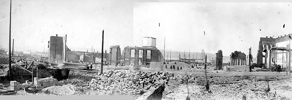 By the morning of June 7, the fire had burned 25 city blocks, including the business district, four of the city's wharves, and its railroad terminals.[10] The fire would be called the most destructive fire in the history of Seattle.[4] Despite the massive destruction of property, few to no deaths occurred. Some claim a young boy named James Goin was killed in the blaze although no reliable records have been found from that time.[11] However, there were fatalities during the cleanup process. Over 1 million rodents were killed.[8] Total losses were estimated at nearly $20 million ($700 million in 2024 dollars).[12]