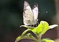 This species seeks out appropriate plant hosts for oviposition by detection of compounds called glucosinolates present in the family Brassicaceae.[4] Adults appear to prefer to lay their eggs on certain areas of the plant. On kale leaves, for example, the preferred regions are the apical, medium and basal parts of the leaves.[5] The average number of eggs laid is about 43 with as many as 245, being laid singly or in clusters.[6] A. m. monuste has been observed feeding on the chorion soon after hatching as their first food, as well as larvae feeding on eggs. It has been suggested that this behavior provides them with extra protein.[6] If a female oviposits on a plant already supporting conspecifics, cannibalism is more likely. Since they have a high growth rate and a non-regulated body temperature, herbivorous insects require a higher quantity of protein. It is questionable that A. monuste is strictly herbivorous as they often consume conspecific eggs.[7] Larvae have been seen consuming whole eggs from the same clutch or others nearby on the same leaf. This behavior appears to be advantageous from an evolutionary stand point as this is an opportunistic behavior and can increase fitness.[8]