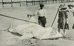 A report of a specimen reportedly measuring 6.4 m (21 ft) in length and with a body mass estimated at 3,175–3,324 kg (7,000–7,328 lb)[63][64][70] caught in 1945 off the coast of Cuba was at the time considered reliable by some experts.[64][71][70][72] However, later studies revealed this particular specimen to be around 4.9 m (16 ft) in length, i.e. a specimen within the typical maximum size range.[4]