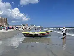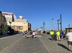 The first boardwalk was built in 1870 along a portion of the beach in an effort to help hotel owners keep sand out of their lobbies. Businesses were restricted and the boardwalk was removed each year at the end of the peak season.[39] Because of its effectiveness and popularity, the boardwalk was expanded in length and width, and modified several times in subsequent years.