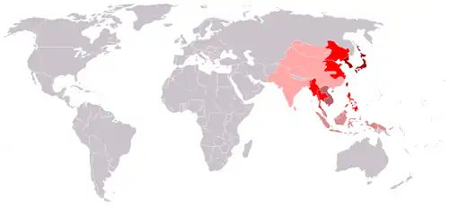 As Japan had about two million soldiers fighting in China, making it by far the largest theatre of operations for Japan, by 1943 the Tōjō cabinet had decided to make peace with China to focus on fighting the Americans.[26] The idea of peace with China had first been raised in early 1943, but Tōjō had encountered fierce resistance with the Japanese elite to giving up any of the Japanese "rights and interests" in China, which were the only conceivable basis for making peace with China.[5] To square this circle about how to make peace with China without surrendering any of the Japanese "rights and interests" in China, it was believed in Tokyo that a major demonstration of Pan-Asianism would lead the Chinese to make peace with Japan, and join the Japanese against their common enemies, the "white devils".[26] Thus, a major theme of the conference was by being allied to the United States and the United Kingdom, Chiang Kai-shek was not a proper Asian as no Asian would ally himself with the "white devils" against other Asians. Weinberg noted that in regards to Japanese propaganda in China, "the Japanese had in effect written off any prospects for propaganda in China by their atrocious conduct in the country", but in the rest of Asia the slogan "Asia for Asians" had much "resonance" as many people in Southeast Asia had no love for the various Western powers who ruled over them.[27]