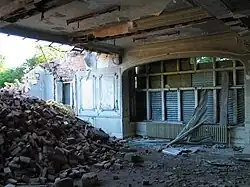 The hall suffered from acts of vandalism and arson after it closed and its owners claimed it was beyond repair. Applications were made to demolish the building,[1] and other buildings including the landmark water tower. Despite having Listed building status Greaves Hall suffered arson attacks which led to its partial demolition in 2003 and 2005. The building was removed from the heritage at risk register in 2009 and demolished shortly afterwards, having become structurally unsafe. Demolition took two months due to the grand scale of the building.