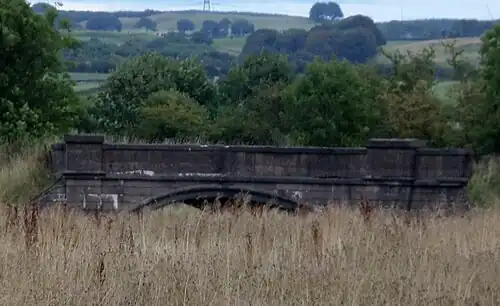 Railway workers cottages were never built at the site probably as the facility was small and this area had good transport being located on the A736 Lochlibo and the village of Lugton was nearby. The Gree Goods station site was located partly in a cutting and the whole site became an infill in the later 20th century so that nothing remains visible apart from the two typical 'Concrete Bob's' McAlpine's concrete road overbridges and the railway cutting on the other side of the minor road to Brownhill Farm. Gree Viaduct was demolished in 2002.[5]