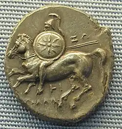 Some tyrants in Magna Graecia advertised their victories in the Olympic Games by striking coinage that referred to these specific achievements.[3]
