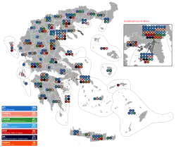 New Democracy won a substantial plurality of 108 seats thanks to Greece's majority bonus, but ND and PASOK were the only pro-bailout parties present and now lacked a majority between them. Conversely, the anti-bailout parties were deeply divided between left and right. ND leader Antonis Samaras,[3] Syriza's Alexis Tsipras,[4] and PASOK's Evangelos Venizelos all tried and failed to put together governments in the days following the election.[5] On 16 May, President Karolos Papoulias appointed Panagiotis Pikrammenos as caretaker Prime Minister and scheduled a new general election for 17 June.[6]