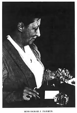 A diary of Charles W. Chesnutt noted he was a replacement speaker for Walter Hines Page for a talk in 1899 on the condition of African-Americans in the South, and commented on witnessing a diversity of clothing representing cultures of the world.[44] Farmer's farewell address for the 1899 season was printed in the Boston Evening Transcript and contained warm thoughts of the development of the work and its ongoing goals.[45] A beatific booklet Greenacre on the Piscataqua of some 22 pages with a section written in August 1899 and another in September 1900 was published.[4] Baháʼís have identified a quote from the religion in the 1899 program and speculate Farmer had heard of the religion.[11]: pp.27–9 However, in Farmer's life and the structure of Greenacre there was crisis. According to scholar Eric Leigh Schmidt Sanborn was working for a "creation of a new shrine" for transcendentalism akin to reforming the Concord school centered on Emerson and used his coverage work of Greenacre in newspaper stories to frame that development while at the same time Janes drifted explicitly from Farmer's approach by charging people for the classes and insisting on academic credentials and approaches to understand the diversity of religions.[7]: pp.199–200 Janes' disconnect from Farmer had reached the point of shutting down the Monsalvat school.[46] There were also tensions between Sanborn and Janes and among other groups.[47] There had been speculation on Farmer being bought out,[48] creditors were nervous,[49] and her business partners had thought to force Farmer to sell out.[18]