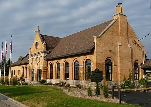 The depot is a waypoint on the Packers Heritage Trail. It was built primarily of brick and stone in the Flemish Renaissance Revival style by Charles Sumner Frost of Chicago, Illinois. The architecture is unusual in that most depots of that time were built in the Craftsman or Romanesque styles. The depot is a rectangular, single story building with a passenger waiting area on one end and a freight room at the other.