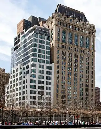 130 Cedar Street (left) and 90 West Street (right) as seen from the National September 11 Memorial to the north