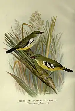 The green avadavat or green munia (Amandava formosa) is a species of Estrildid finch with green and yellow on the body, a bright red bill and black "zebra stripes" on the flanks. They are endemic to the Indian subcontinent and were formerly popular as cagebirds. The name "avadavat" is a corruption of the name the city of Ahmedabad in Gujarat, India, which was a centre of bird trade.[3] They have a restricted distribution and populations are threatened by the bird trade.