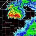 The most intense supercell thunderstorms developed in the early evening hours of May 4 across northwestern Oklahoma and southwestern Kansas. One of these eventually produced 20 to 22 tornadoes, including the Greensburg tornado and its satellites.[9][10][11] Multiple supercells first developed near the Kansas-Oklahoma border, to the south and southeast of Dodge City, at around 7:30 p.m.[12] Over the next hour the cells combined into one large supercell near U.S. Route 183.[12] At around 8:30 p.m., storm spotters began reporting wall clouds,[13] with the first well-defined funnel clouds being observed around 8:45 p.m; small tornadoes touched down from that time to around 15 minutes later.[14] At 9:25 p.m., a well-defined hook echo, a radar signature often indicative of a mesocyclone within a thunderstorm, was located in southern Kiowa County.[15] This hook echo was accompanied by the Greensburg tornado, which touched down at 9:03 p.m. south of Greensburg.[16][17]