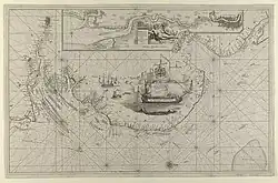 Collins eventually spent seven years on the survey, at first on the Merlin and Monmouth, later aboard the Martin and Younge Spragge. As well as his own observations, he likely included existing charts and seamen's sketches and notes, and published charts as they were completed. Collins began gathering engraved copper plates with which to print his charts while he was engaged on the survey, and continued gathering more plates in the years following. In 1693, he finally published his results in a folio volume of two parts, Great Britain's Coasting Pilot, containing sailing directions, tide tables, coastal views and about forty-nine charts. The charts were not completely accurate, but with all their shortcomings they were an enormous advance on anything before them, and entitled Collins to rank not only with the earliest, but with the best of English hydrographers. The work covered England and Scotland, and though Collins proposed a further study to cover Ireland, the plan came to nothing. Collins recorded that he had spent £40 on instruments, and charged £80 for the 120 manuscript maps he delivered. With his claim for expenses set at £200 per annum, and his wages of £394 10s., he claimed a total of £1914 10s. for his work, which was eventually paid in arrears. The cost was more than three times the original estimate.[1] His cousin, Freeman Collins, printed the Coasting Pilot, which Richard Mount sold. Mount's subsequent firm then went on to publish twenty-one further editions of the pilot throughout the nineteenth century. The Sudbrook Press published the book as a reduced facsimile in 1964, followed by Early English Books first in microfilm and then online.