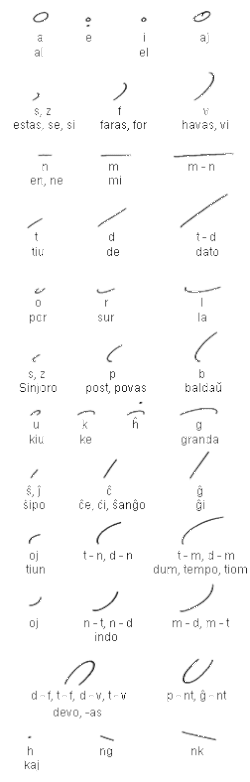 Initially, John Robert Gregg taught an adaptation of Duployan shorthand for English, a system that was predominant in France and characterized by uniform stroke thickness and attached vowel representation.[5] However, he found the angular outlines of Duployan-based systems to be detrimental to speed.[6]