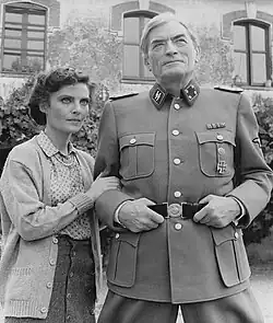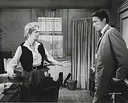In 1956, Peck made a foray into the film production business, organizing Melville Productions and later, Brentwood Productions.[245] These companies produced five movies over seven years, all starring Peck,[245] including Pork Chop Hill, for which Peck served as the executive producer.[246] The films were observed by some as being more political,[29] although Peck said he tried to avoid any "overt preachiness."[126] In 1958, Peck and good friend William Wyler co-produced the Western epic The Big Country (1958) separate from Peck's production company.[247] The project ran into numerous issues. Wyler and Peck were dissatisfied with the script, which underwent almost daily revisions after each day's shooting, causing stress for the performers;[248] the actors would arrive the next day and find their lines and even entire scenes different from what they had prepared.[249] The stellar cast included Jean Simmons, Carrol Baker, Chuck Connors, Charlton Heston and Burl Ives; Ives won the Academy Award for Best Supporting Actor for his intense performance. There were disagreements between director Wyler and the performers, resulting in Peck storming off-set when Wyler refused to re-shoot a close-up scene;[248] Peck and Wyler's relationship remained strained for three years after production.[248][249] Peck said in 1974 that he had tried producing and acting simultaneously and felt "either it can't be done or it's just that I don't do it well."[237]