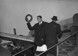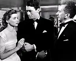 Peck's next film was the first of two collaborations with director Alfred Hitchcock, the suspense-romance Spellbound (1945), opposite Ingrid Bergman. Peck plays a man who is thought to be the new director of the psychiatric facility where Bergman's character works as a psychoanalyst, while his amnesia and disturbing visions suggest he may be a murderer.[43] Peck and Hitchcock were described as having a cordial but cool relationship.[44] Hitchcock initially hoped that Cary Grant would play the male lead.[45] Peck later stated that he thought he was too young when he first worked with Hitchcock and that the director's on-set indifference to his character's motivation, important to Peck's acting style, shook his confidence.[29] Peck's chemistry clicked with his screen partner Bergman; the actors were romantically linked at the time.[46]