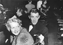 Peck shared top billing with Anne Baxter in the Western Yellow Sky (1948), named for the ghost town where Peck's group of bank robbers seek refuge and encounters the spunky tomboy Baxter, her grandfather, and their gold.[101] Peck gradually develops an interest in Baxter's character, who in turn seems to rediscover her femininity and develops an interest in him.[102][q] Critics who commented on Peck's performance felt it to be solid,[r][104] but said the plot was slightly unbelievable.[s][103] The film was only moderately commercially successful.[105] A year later, Peck was paired with Ava Gardner for their first of three films together in The Great Sinner (1949), a period drama-romance where a Russian writer, Peck, becomes addicted to gambling while helping Gardner and her father pay back their debts.[106] Peck ended up becoming great friends with Gardner, and would later declare her his favorite co-star.[14] Their friendship lasted the rest of Gardner's life, and upon her death in 1990, Peck took in both her housekeeper and her dog.[107] The film received unfavorable reviews usually describing it as dull,[t] and the public was not interested, rendering it a commercial disappointment.[109] In modern times, the film has received mixed reviews[u][55] but TV Guide says "this often gripping film" has strong performances, that "Peck is powerful" in his portrayal.[110] Peck initially rejected the film, his last movie under his MGM contract, eventually agreeing to do it as a favor to the studio's production head.[111]