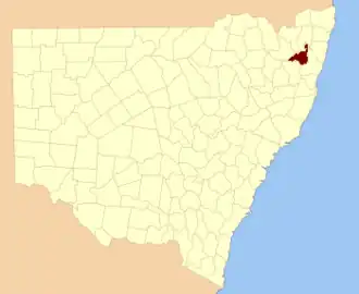 Gresham County was named in honour of the London merchant, Sir Thomas Gresham (1519–1579).[1] It is located to the south of parts of the Mann River, Nymboida River and Clarence River. It includes parts of the Guy Fawkes River National Park.