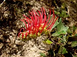The flowers are arranged in clusters on a 20–40 mm (0.79–1.57 in)-long rachis, and are greenish yellow, ageing to orange or reddish. The pistil is 18–26 mm (0.71–1.02 in) long and the style is greenish-yellow or dull pink. Flowering occurs from October to December but the plant is not known to produce fruit.[2][3]