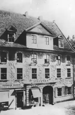 In 1857, C.F. Theodor Steinweg and Grotrian moved the piano factory to Braunschweig, setting up shop in a former mayor's mansion at 48 Bohlweg Street in the inner, medieval part of the city.[11] The company employed about 25 people at this time. Friedrich Grotrian died on 11 December 1860, leaving his share of the company to his son Wilhelm (1843–1917).[2] In 1865, C.F. Theodor Steinweg was needed by his family in New York to help manage Steinway & Sons after his brothers Henry and Charles died. Wilhelm Grotrian joined with two of the piano workmen—Adolph Helfferich and H.D.W. Schulz—to buy out C.F. Theodor Steinweg's share of the building. The new partnership paid for the right to use the trademark "C.F. Th. Steinweg Nachf.", meaning, "Successor to C.F. Theodor Steinweg." (Nachf. is an abbreviation for Nachfolger—German for successor.) The company name became "Grotrian, Helfferich, Schulz, Th. Steinweg Nachf."[10] Wilhelm Grotrian raised two sons in the 1870s: Wilhelm "Willi" Grotrian Jr (1868–1931) and Kurt Grotrian (1870–1929).[2]
