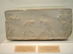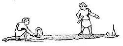 There are hints that ground billiards may be far more ancient than the Late Medieval period.[3]: 5 [7] At least as early as 360 BCE, Romans played a somewhat golf-like game called paganica that could have degenerated to simpler, smaller-scale lawn games during the Dark Ages.[8][9] Third century BCE Greece has also been proposed.[4] Earlier still, a bas relief dating to c. 600 BCE depicts an ancient Greek ball game, a possible ancestor of both ground billiards and field hockey, which may have been called kerētízein or kerhtízein (κερητίζειν) because it was played with an implement shaped like a horn (kéras, κέρας).[10][b] It appears to be basically the same as the Medieval European activity of c. 1300 CE.[1]: 2, 5, 27 An ancient Greek game said (in Leila Dorion's and Julia Shepherd's 1928 History of Bowling and Billiards) to be "analogous to billiards" was reported in Greek writings around 400 BCE, contemporary with the game's play.[4]