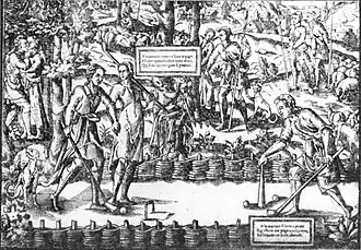 The balls, mace, and other equipment for ground-billiards games were probably most commonly made of wood. The Complete Gamester, covering only the indoor variant favored by the wealthy, recommended hardwood such as lignum vitae for maces, and expensive ivory for balls and other equipment,[13] but ivory's fragility would have made it impractical for the larger-scale and more forceful outdoor version of the game. Enquire Within suggested lignum vitae or boxwood for the balls. Early king pins were sometimes made of bone.[15] Clay was also popular for balls in such games (including lawn-bowling varieties). Some illustrations suggest port hoops made of decorative wrought iron, while others are clearly of wood, stone, or another carved substance, and later examples are thin and wiry, similar to modern croquet hoops (wickets). The nature of the mace appears to move from crude to elegant over time, with earlier illustrations showing simple hammer- or crook-like implements, with players stooping, while later woodcuts and tapestries show a long, thin device more like a golf putter, and in basic form very similar to later, and more delicate and ornate maces used for table billiards before leather-tipped straight cues became the norm in those games. Similarly, the nature of the playing court appears to have evolved, beginning as any informal patch of ground, and becoming carefully delimited courts of turf or clay bounded by low (often wicker) barriers.[1]: ch. 1 Trucco, as an informal game played mostly at pubs and country houses, could be played anywhere the ground was relatively flat (the conventional Victorian rules simply called for at least 4 yards (3.7 m) from the outer edge of the playing area to the ring on every side).[14] Most woodcuts and other illustrations of ground-billiards games show two players. A few show more (typically waiting and observing on the sidelines), but it is unclear if these represent teams, doubles, individual players in a many-player game, or people waiting their turn.[1]