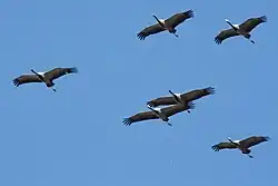 The cranes are diurnal birds that vary in their sociality by season and location. During the breeding season, they are territorial and usually remain on their territory all the time. In contrast in the non-breeding season, they tend to be gregarious, forming large flocks to roost, socialize, and in some species feed. Sarus Crane breeding pairs maintain territories throughout the year in south Asia, and non-breeding birds live in flocks that can also be seen throughout the year.[2][15] Large aggregations of cranes likely increase safety for individual cranes when resting and flying and also increase chances for young unmated birds to meet partners.[5]